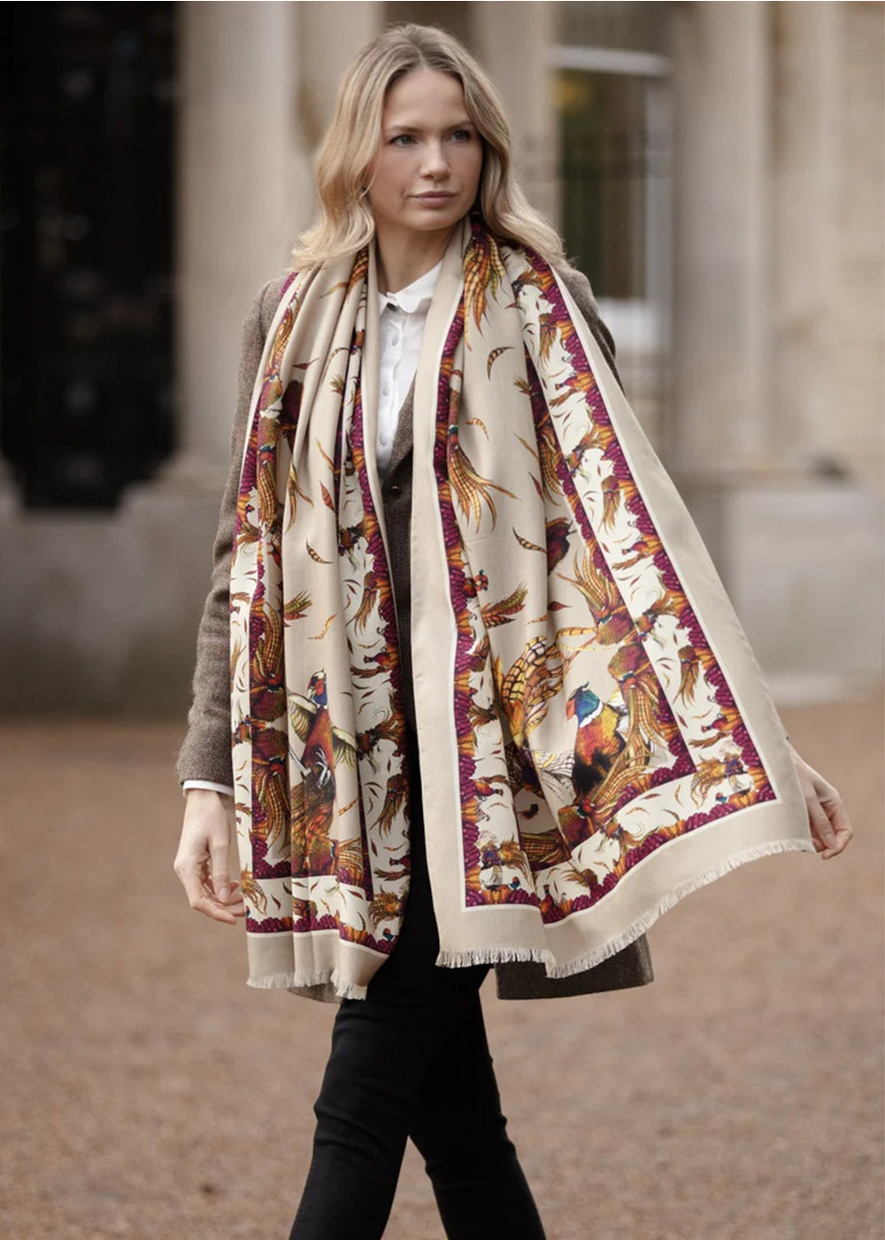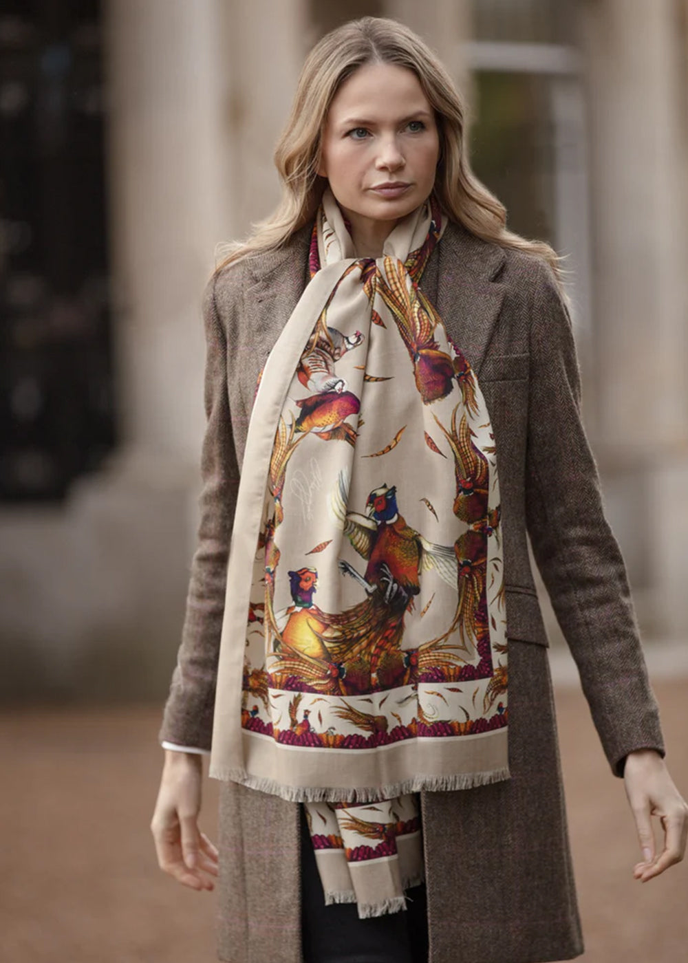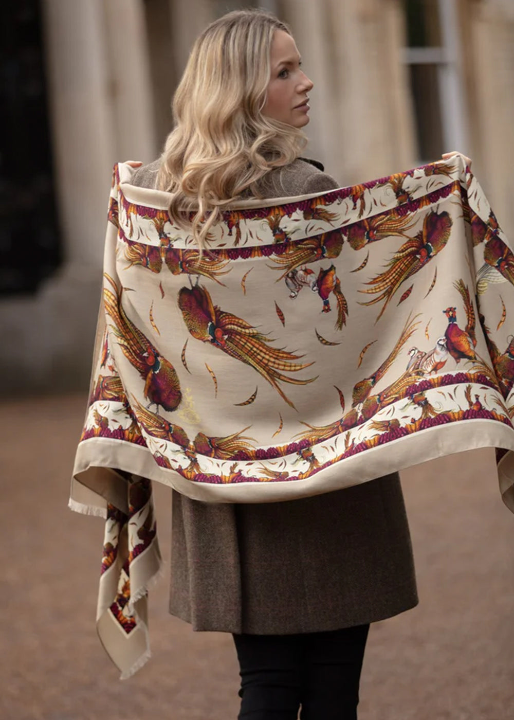 The George & Friends Wrap by Clare Haggas is a beautiful hand designed wrap. This beautiful wrap features a charismatic pheasant and his lively featured companions each illustrated with detail and affection. This stylish accessory will add that finishing touch to any outfit whilst oozing style and sophistication.