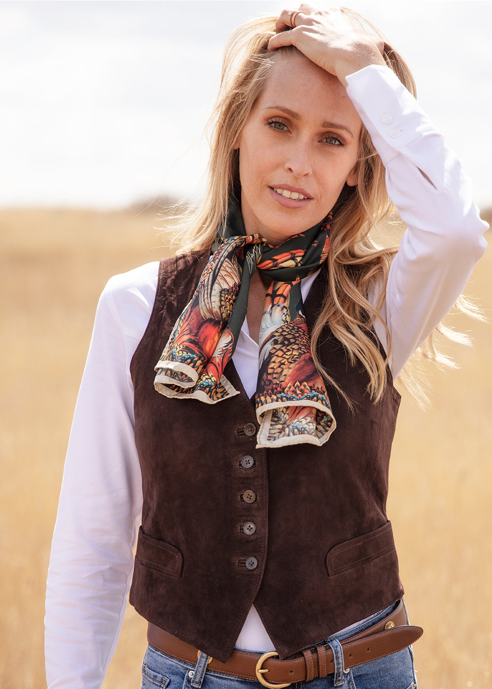 The Heads or Tails Narrow Silk Scarf by Clare Haggas is a beautifully designed silk scarf perfect for accessorising your wardrobe. In an eye-catching design of pheasants jostling for attention, this scarf oozes sophistication and style. Simply drape over the top of your shirt or wear wrapped over your shoulders.