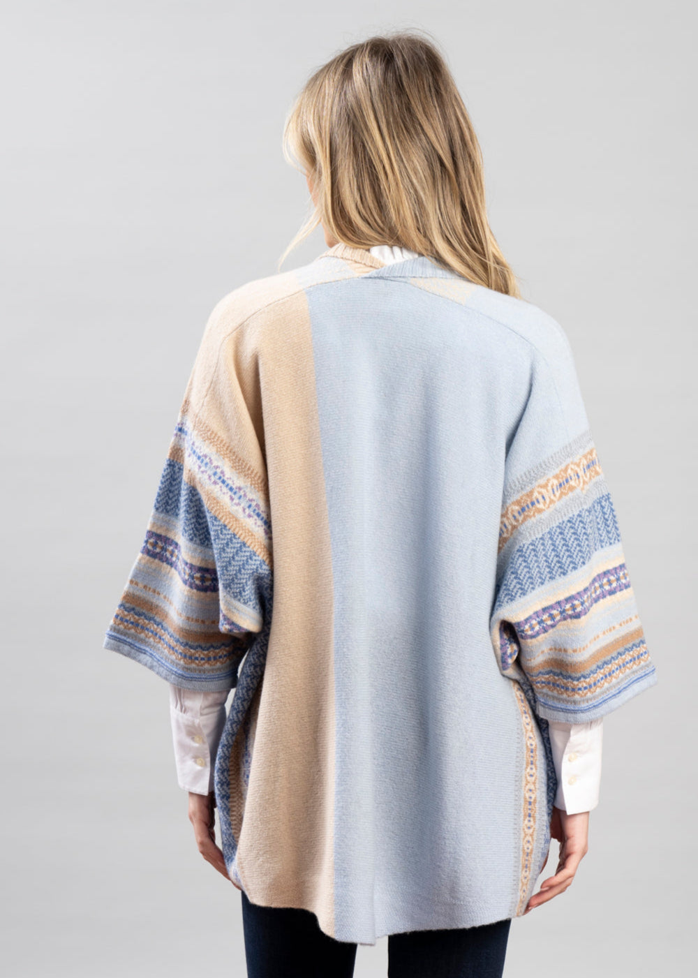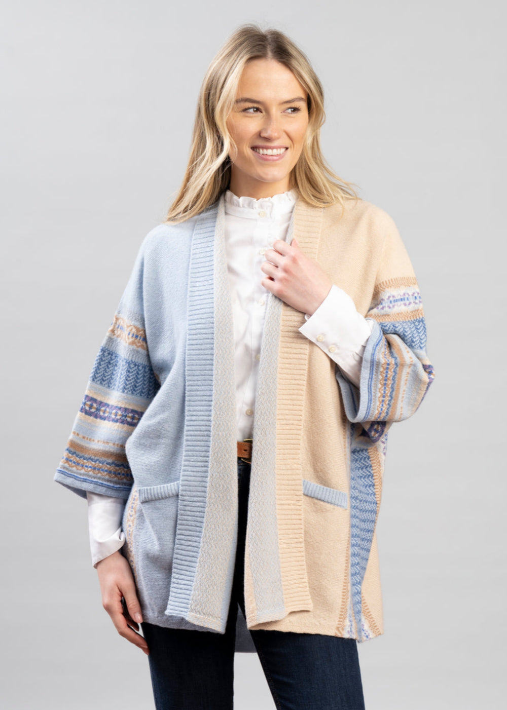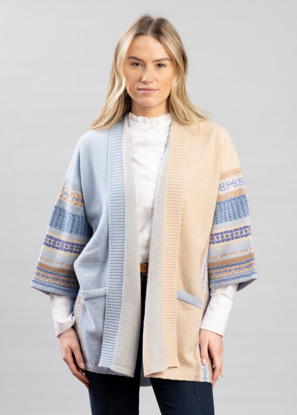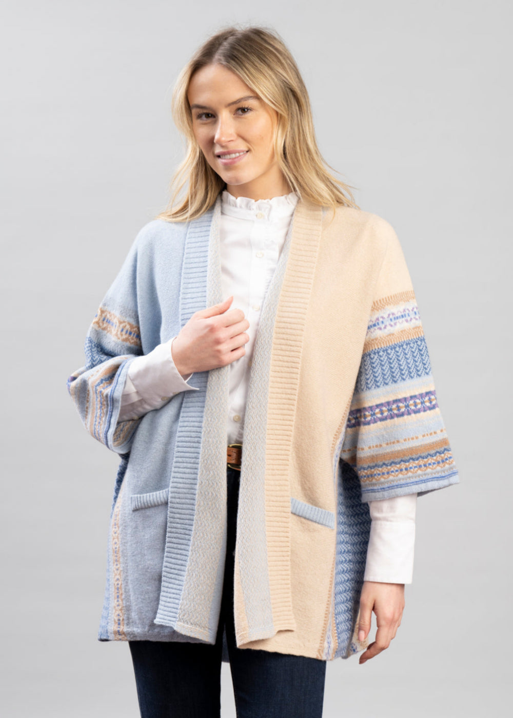 The Montrose Blanket Coat by Eribe is made from 100% lambswool, featuring deep pockets and a striking fairisle design. This oversized coat is designed to be thrown on over a simple outfit.