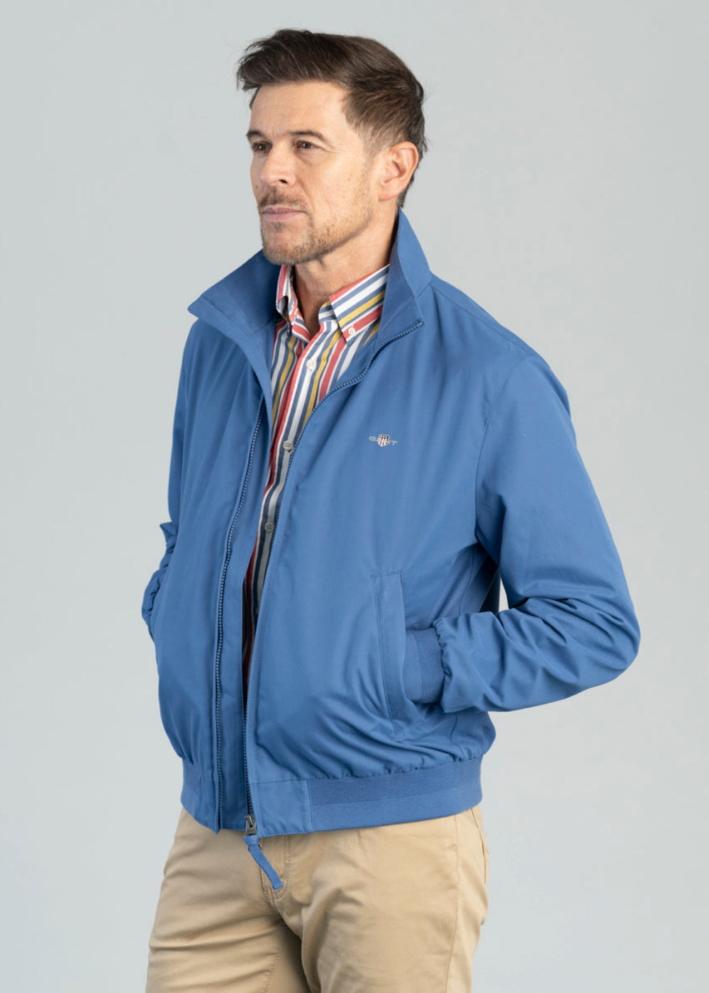 The Gant Hampshire Jacket is made with a lightweight, water-repellent shell, perfect for the changing seasons. Crafted from a soft, peached blend of recycled polyester and cotton, and tailored for a regular fit. The design includes a zip front, stand-up collar, and ribbed cuffs and hem for added comfort. Practical features include side welt pockets, two interior pockets, chest embroidery, and Gant’s signature branded locker loop at the back.