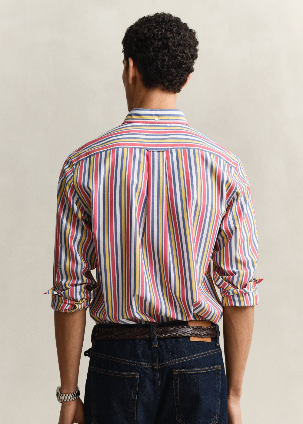 Gant's Multistripe Poplin shirt is made from a crisp cotton poplin with a soft, garment-washed finish. Designed for a regular fit, it features yarn-dyed stripes, a button-down collar, adjustable cuffs, and a curved hem. Recycled polyester buttons add a sustainable touch, while the chest pocket is embroidered with the Gant logo. Pair with jeans or chinos and a casual or smart look.