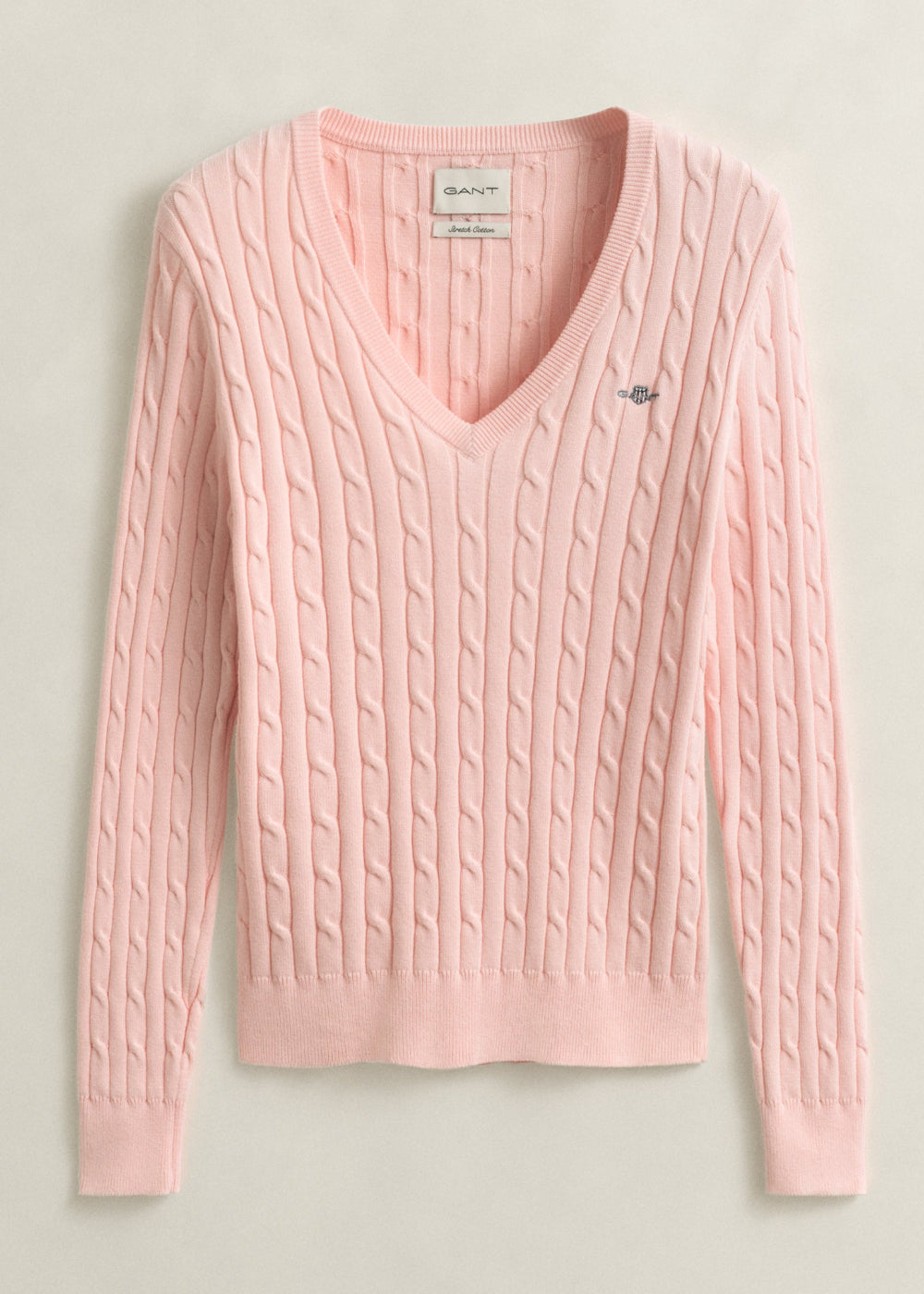 The Cotton Cable V-Neck by GANT offers a slim yet flexible fit for all-day comfort. Crafted from a soft cotton-elastane blend, Designed with ribbed detailing, a classic V-neck, and the signature GANT shield graphic embroidered at the chest. This versatile piece balances heritage with modern style and goes with anything from jeans and tailored trousers to skirts and shorts.