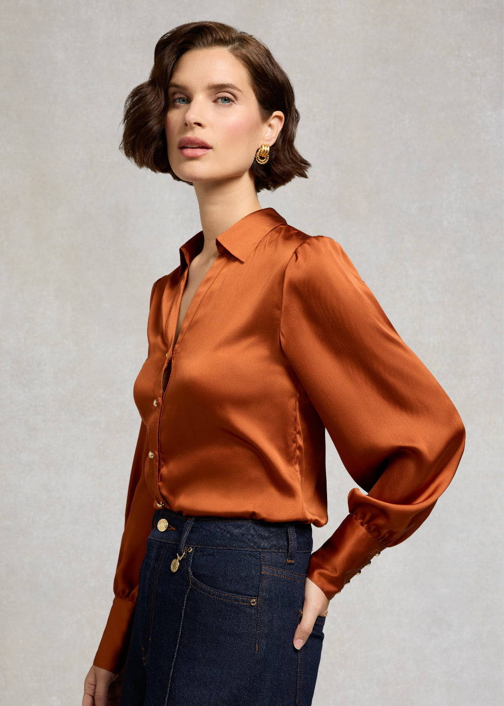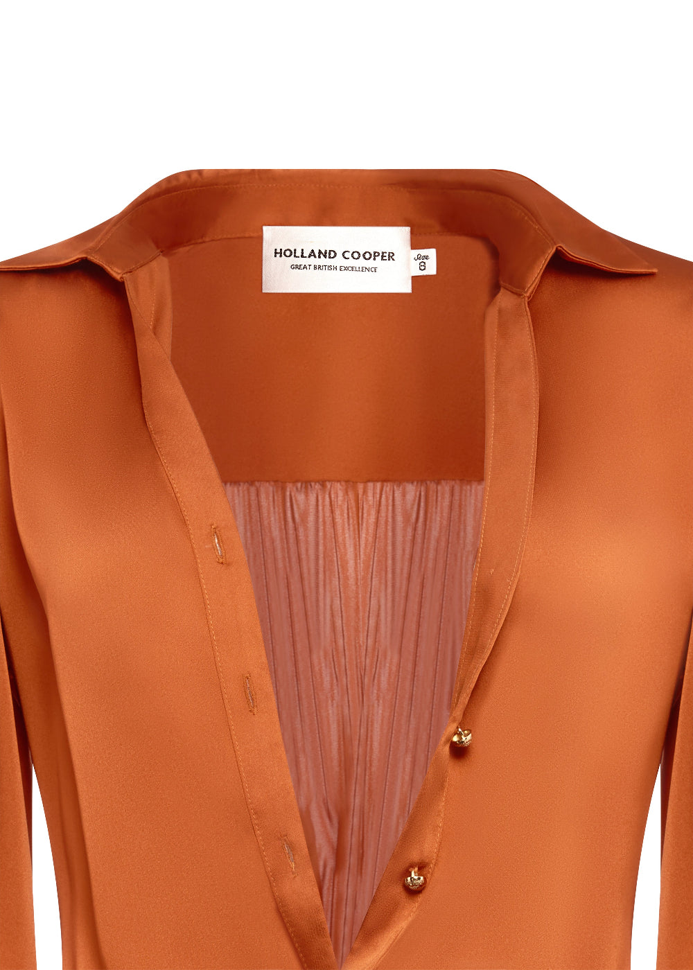 The Holland Cooper Annie Shirt is a timeless style with feminine detailing, crafted from a fluid satin for a refined, polished look. Designed with a classic collar, v-neckline, a button-down placket and full gathered sleeves for an elegant silhouette. A V-shaped back yoke with delicate gathering enhances the fit, while monogram HC embroidery at the cuff and a signature gold HC pin complete the look of the shirt. The perfect shirt for the new season.