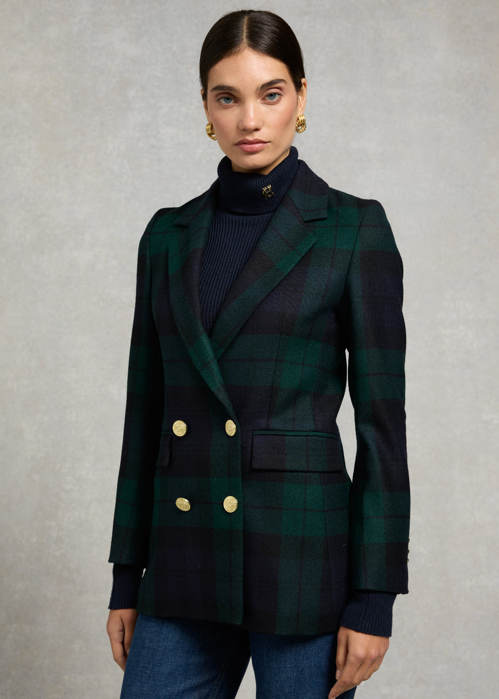 The Holland Cooper Double Breasted Blazer is a timeless wardrobe staple, handmade in the UK from classic tweed. Designed for a sharp silhouette, it features a comfortable stretch lining, bold lapels, subtle hip pockets, and signature HC gold hardware on the front and cuffs. Perfect worn open or closed for a polished look.