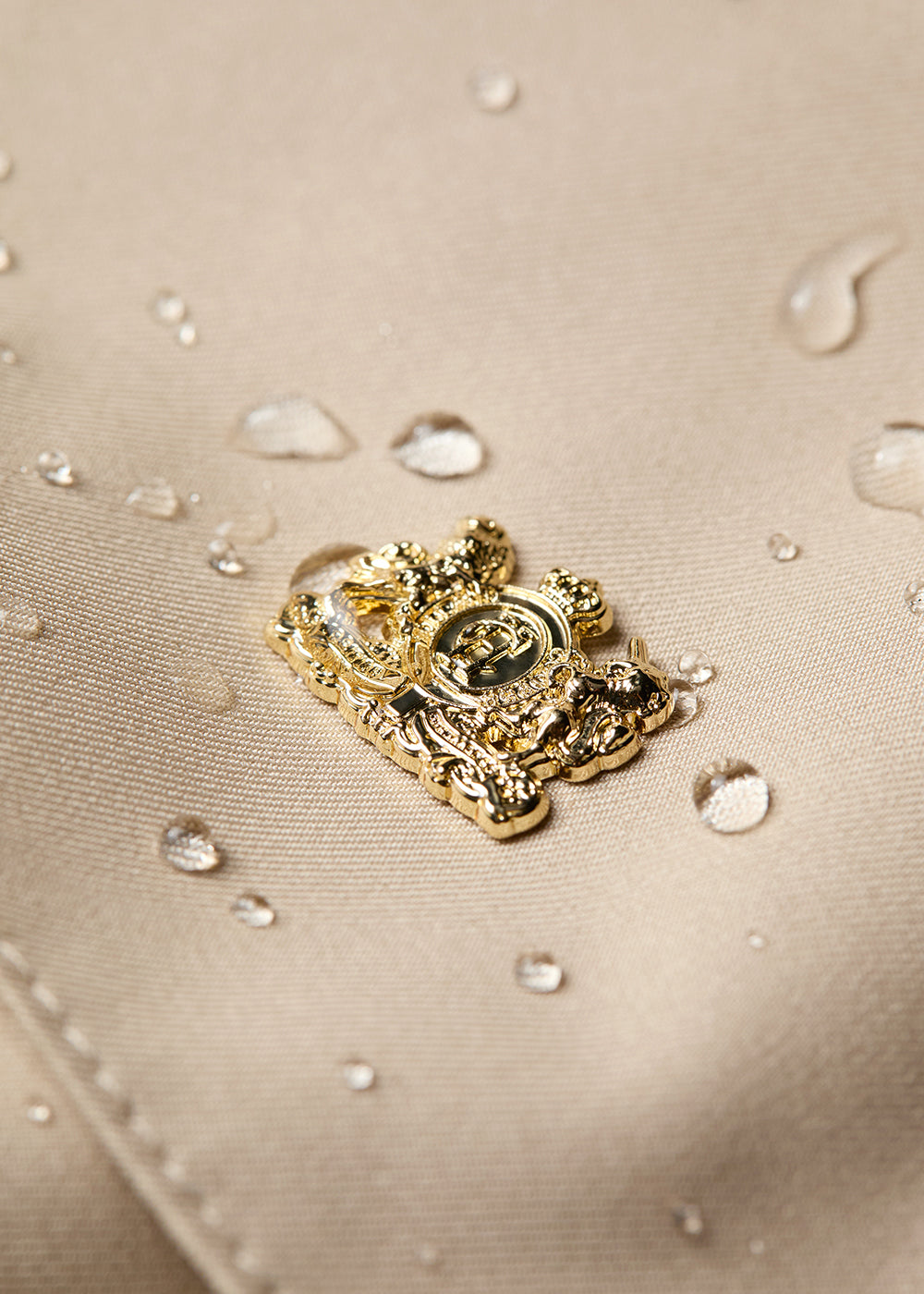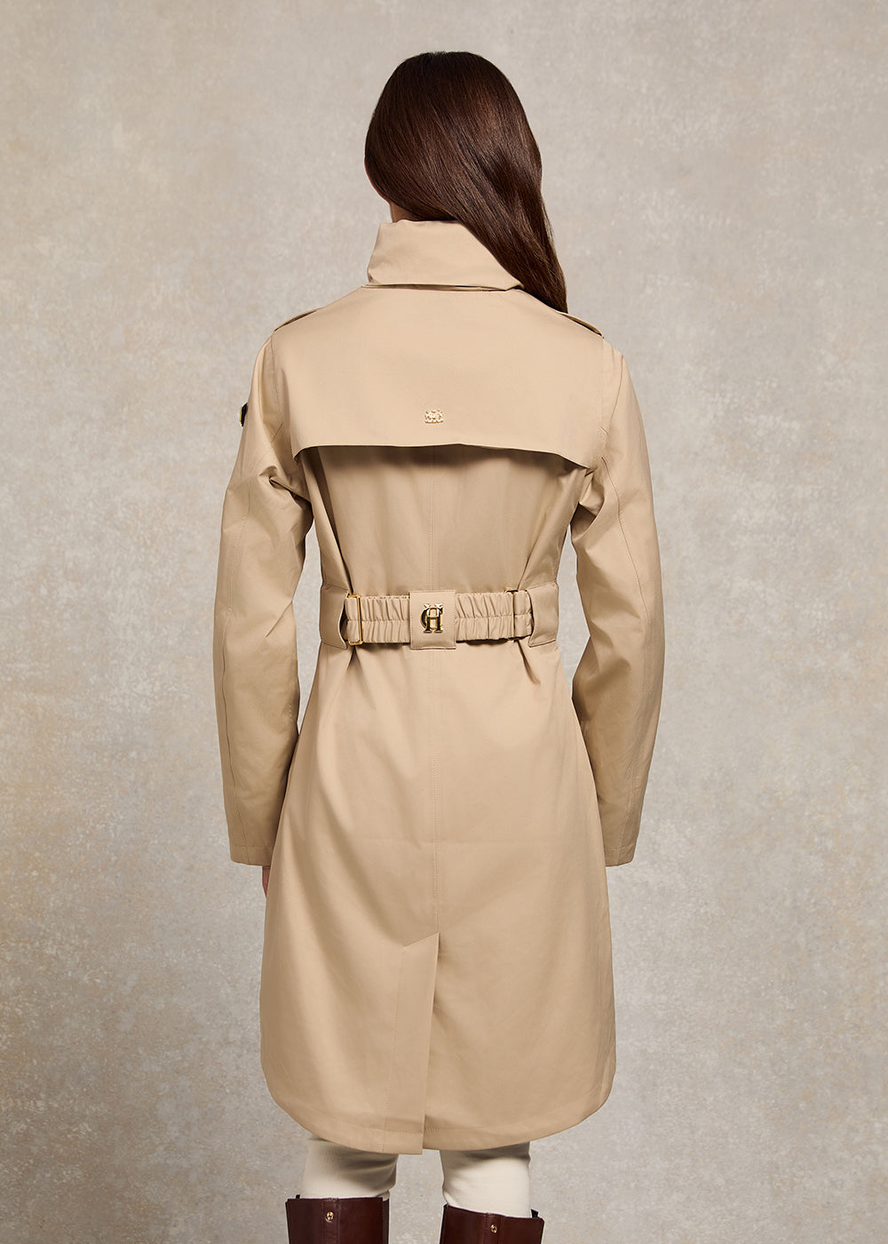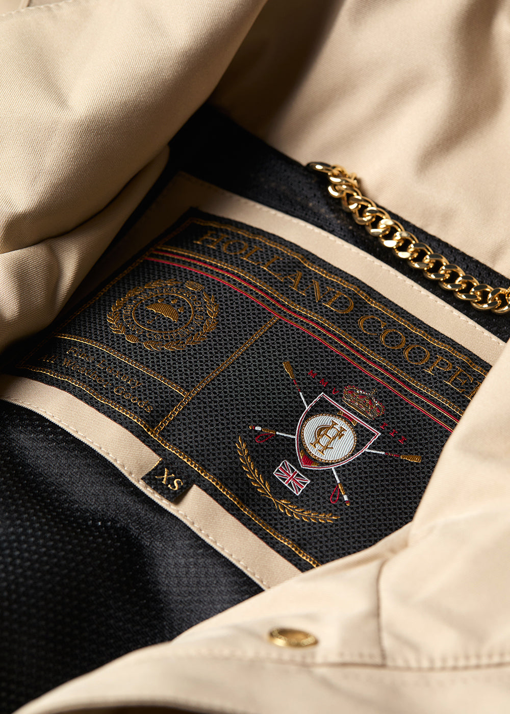 The Rosedale Waterproof Parka by Holland Cooper is a technical parka-style coat designed for both style and functionality. Crafted from high density waterproof shell fabric, this coat ensures you stay dry and comfortable in any weather. Featuring a fabric covered elastic belt with a sophisticated tortoiseshell buckle closure, combining elegance with practicality. The storm plackets with signature gold snap fastenings and front yoke details add a touch of refinement, while the detachable hood offers versatility. The double strap on the cuffs provides a secure fit, and the HC monogram on the back belt loop adds a signature finish.