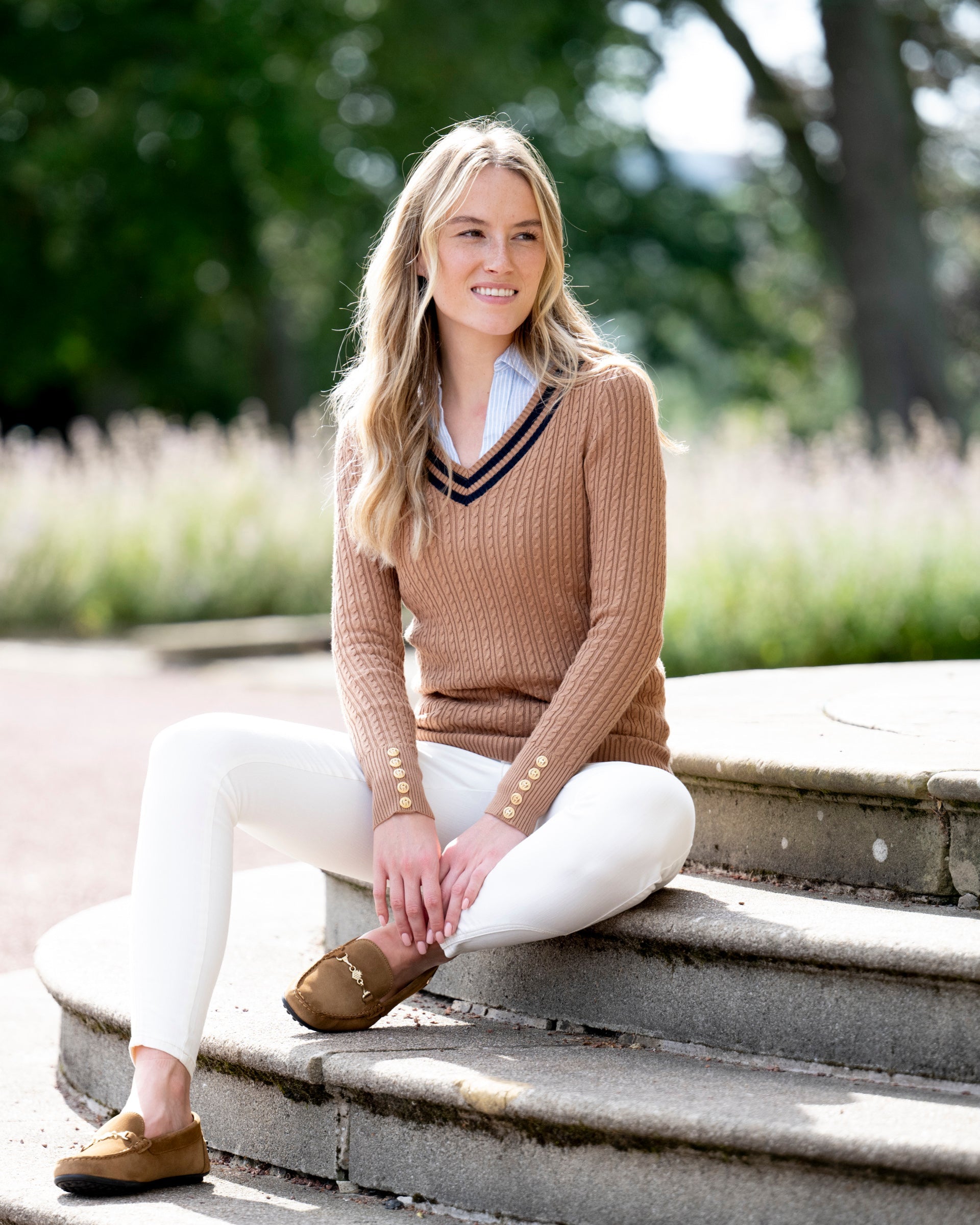 The Holland Cooper Zoe Knit is crafted from a supersoft yarn, designed in a slim silhouette with a deep-v neckline. With distinctive cable knit design and contrasting stripe detail, this jumper is ideal for elevating your everyday style. Iconic Holland Cooper hardware on the cuffs.