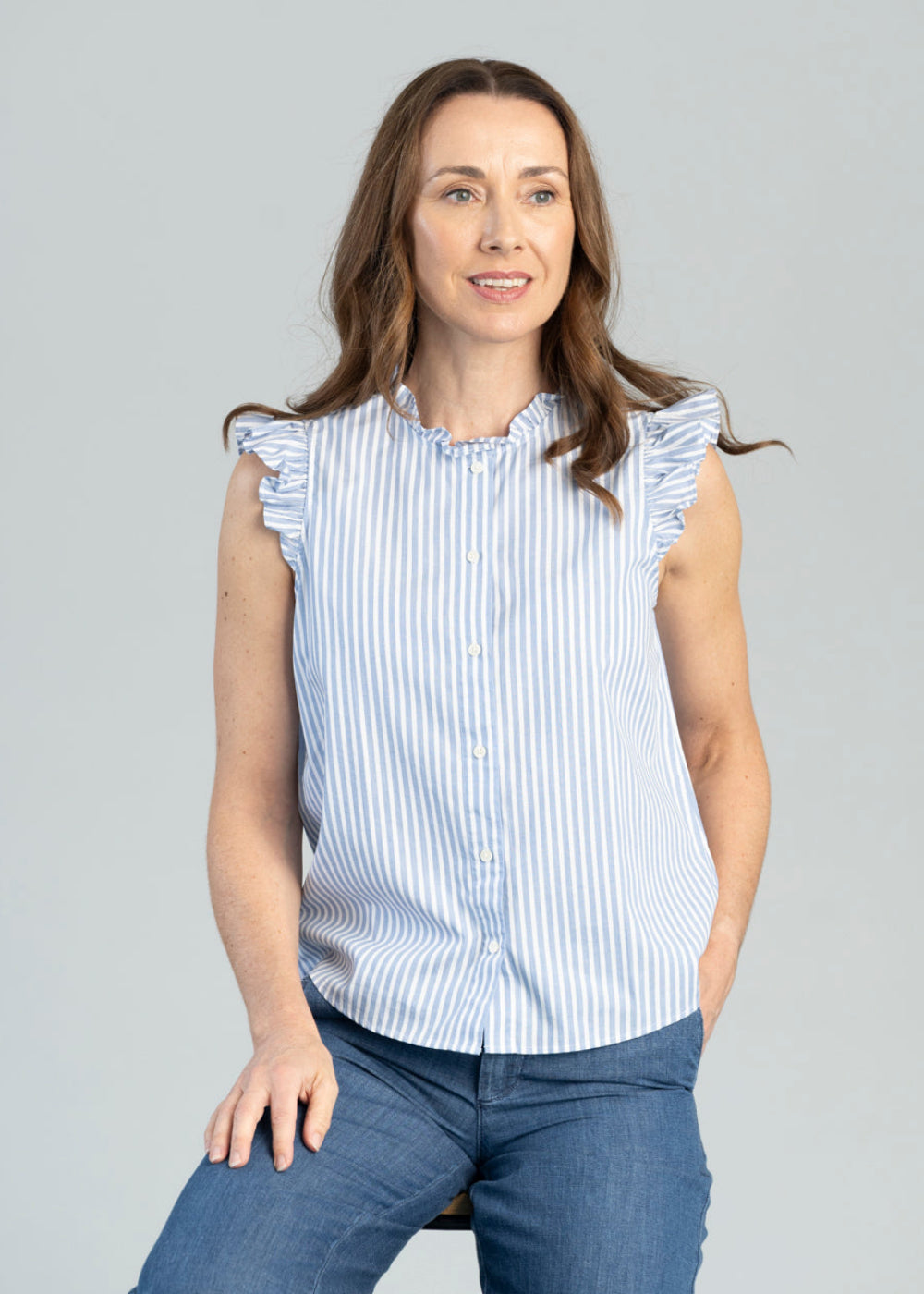 Gant's Cotton Ruffle Striped Blouse is crafted from 100% cotton in a fil-à-fil construction, a plain weave fabric distinguished by its use of contrasting warp and weft threads. Designed without sleeves or a collar, it’s accented with delicate frill detailing at the neckline and armholes. The front placket is finished with recycled polyester buttons for a considered touch. A lovely summer shirt for your wardrobe.