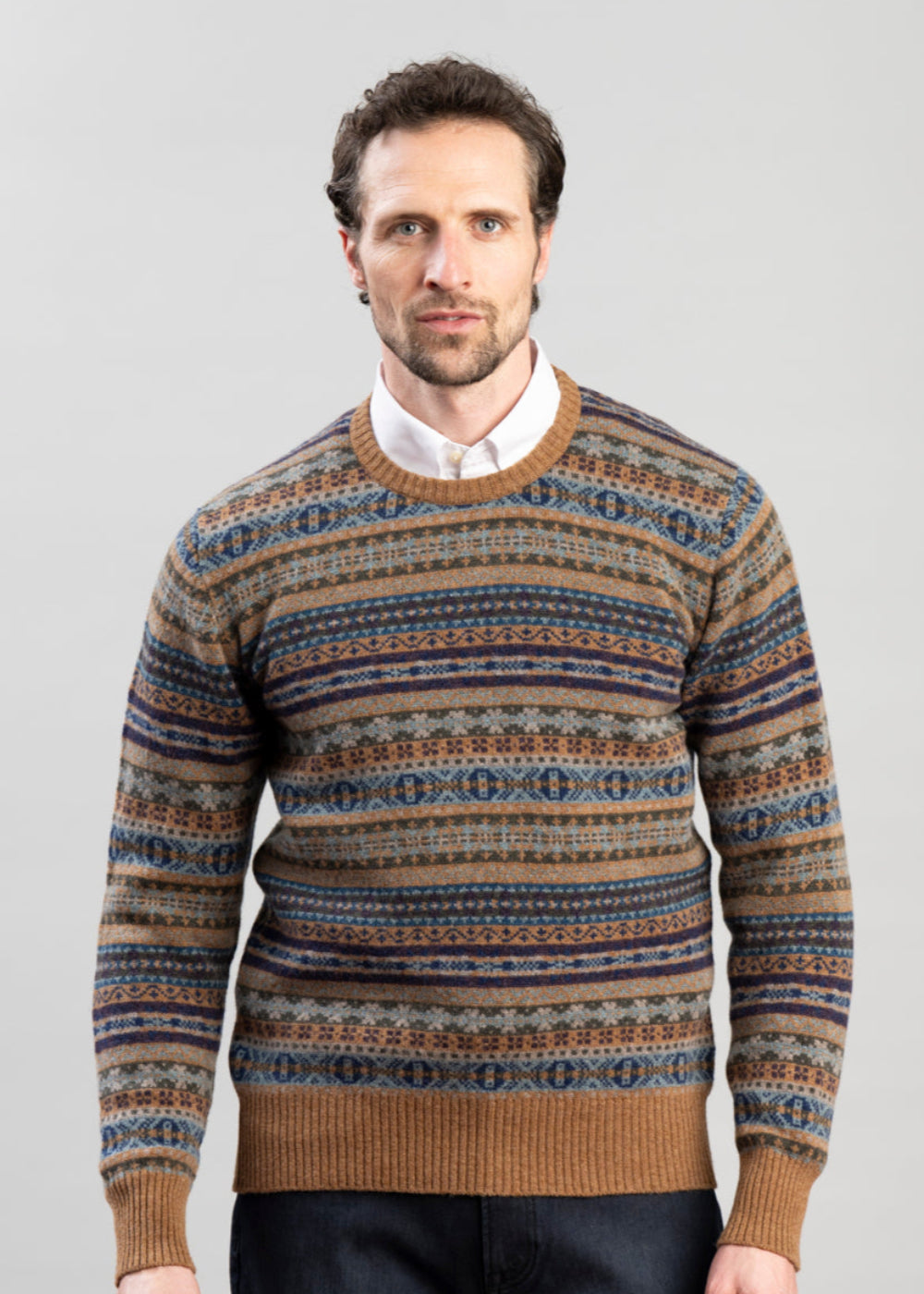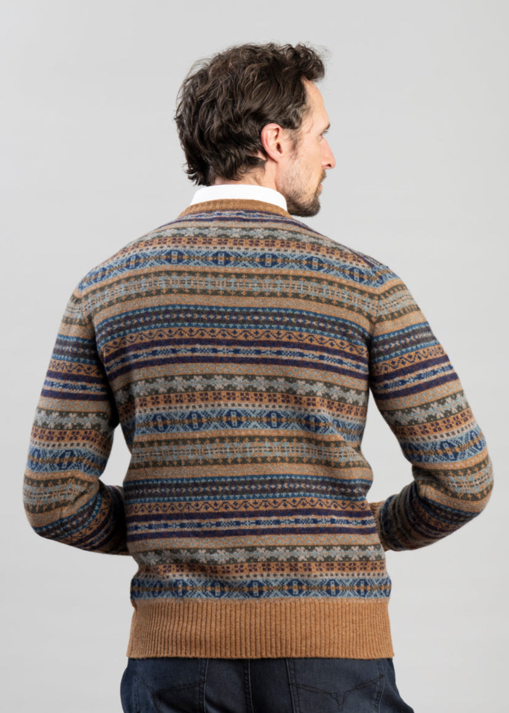 William Lockie's Lambswool Fairisle Crew is knitted in Hawick, Scottish Borders - the home of luxury knitwear. Knitted with lambswool from pedigree sheep in South Australia which are bred especially for their exceptional quality wool. The wool is spun by Z. Hinchcliffe & Son in Yorkshire and is knitted at a tight tension on traditional frames. This sweater will keep you warm and comfortable on those colder days. A must-have addition to your wardrobe.